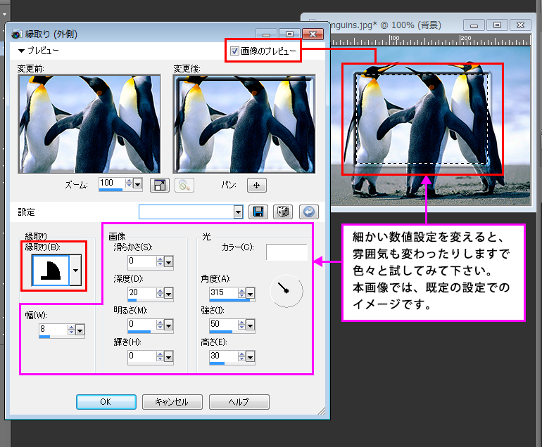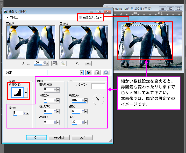 選択範囲の外側に、効果が適用されます。12種類の縁取りをつける効果があります。メニューの表記では、「ベベル(外側)」となっていますが、ダイアログボックスを開いた際は、「縁取り(外側)」と表示されていますが、間違いではありません。