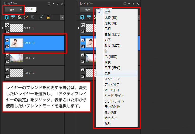 「乗算」モードの場合は、ヘルプにこのように説明されています。乗算は重ねて黒っぽくしていきますので、女性画像の白の部分はモード変更したときに、透けて見えるになります。