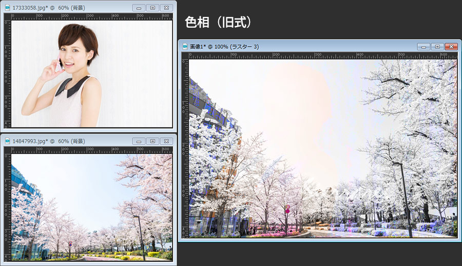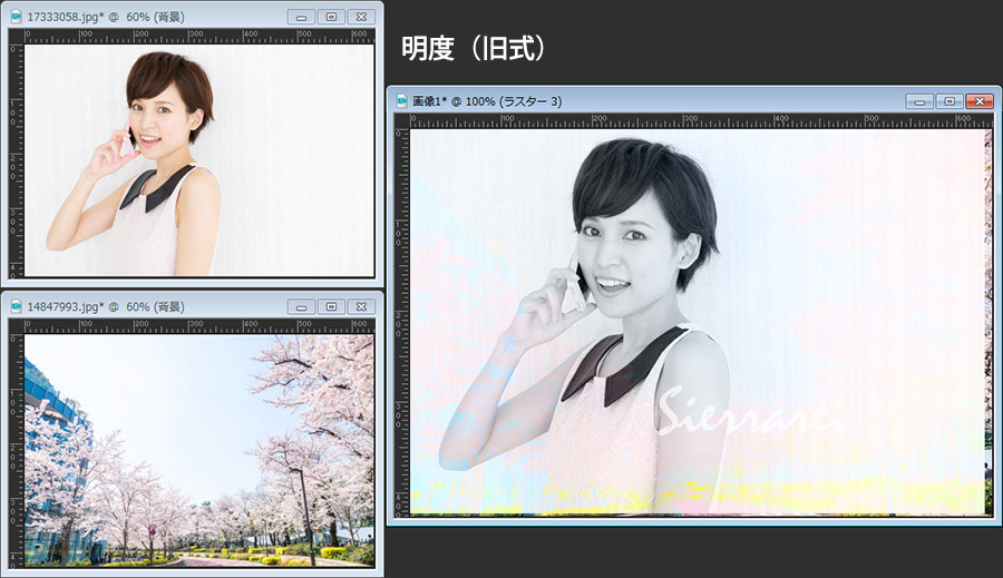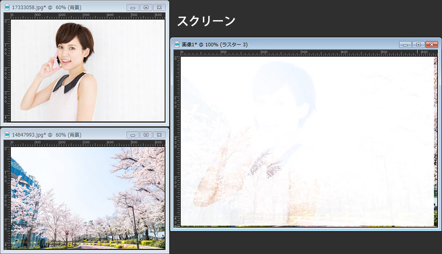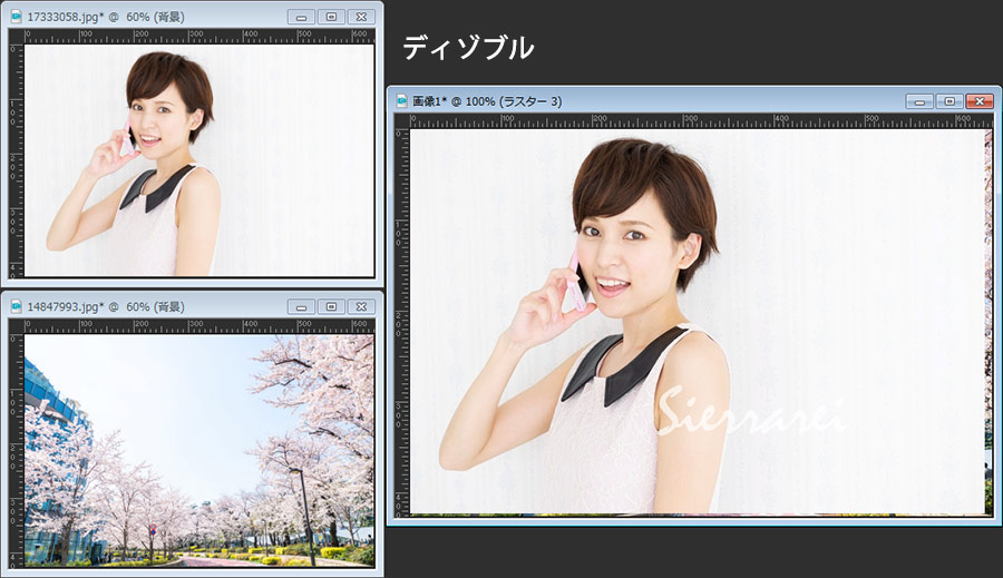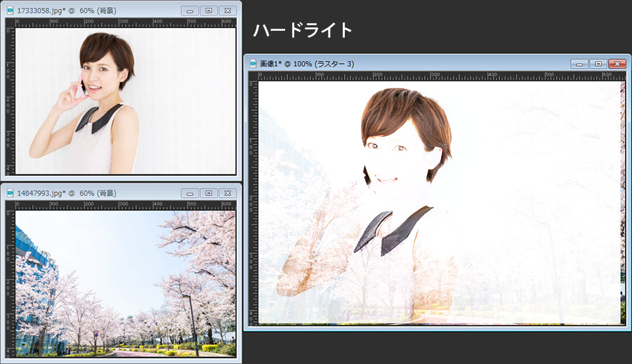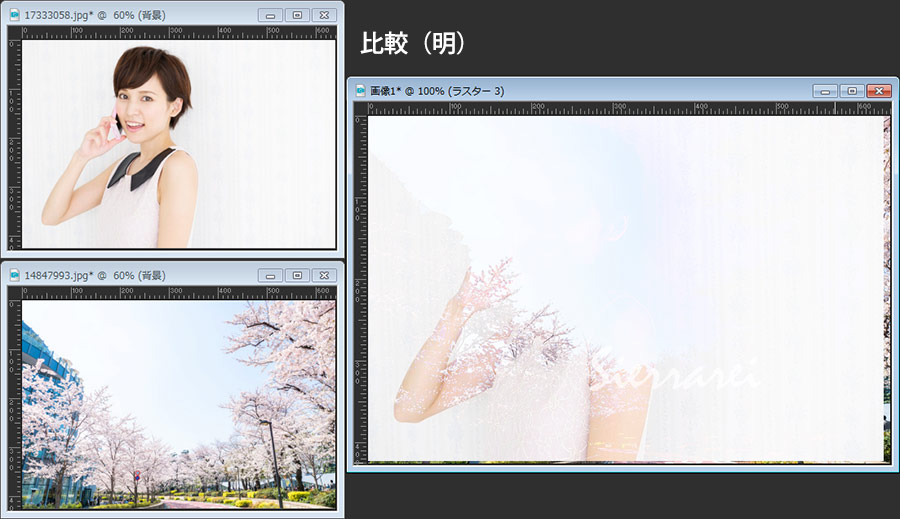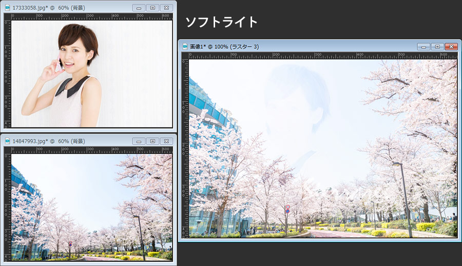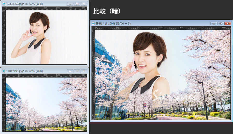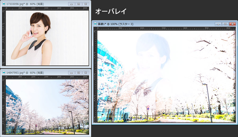 最初に紹介してある画像は、桜の画像の上に女性の画像を重ねてブレンドモードを「乗算」にしただけです。女性の部分だけを切り抜いたり、マスクを掛けたりすることなく自然な感じでなじんでいると思います。
