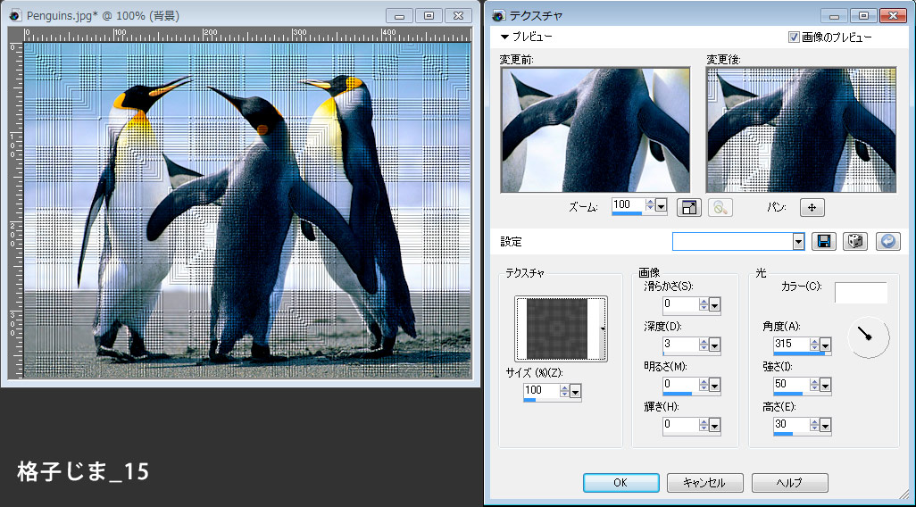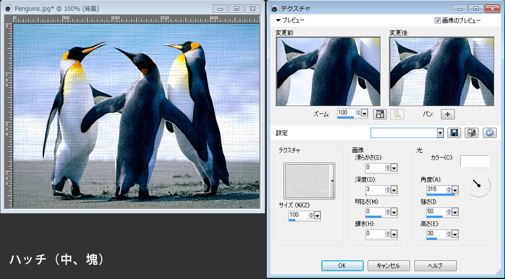 今回のサンプルは全てペンギンの画像に効果をつけているので、違和感のあるものがありますが、テクスチャにあった画像を準備すると効果のリアリティが増してきます。