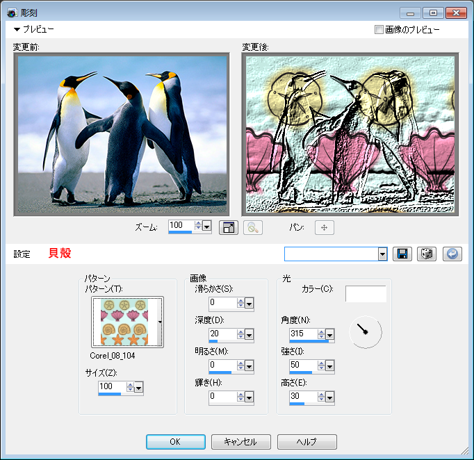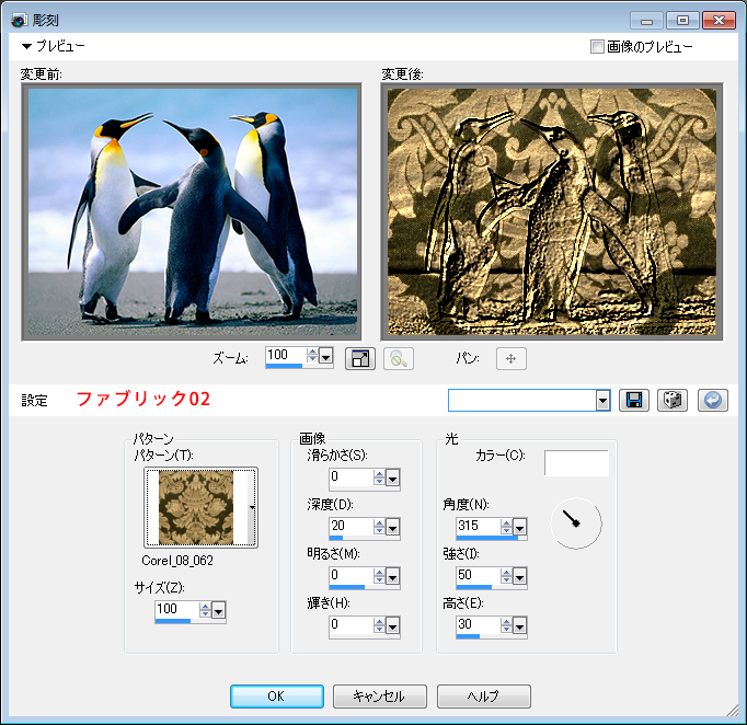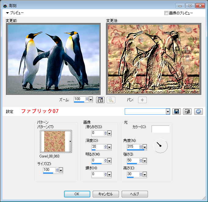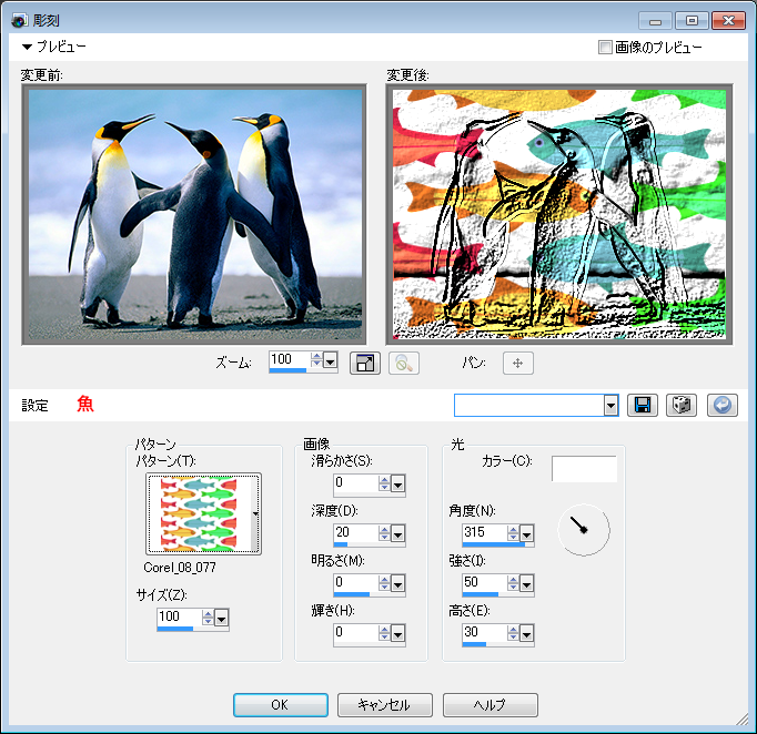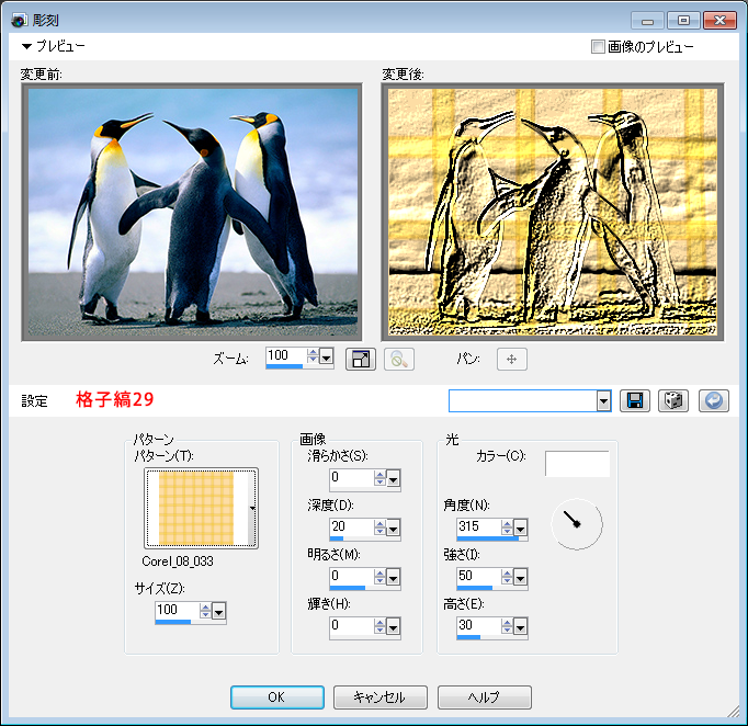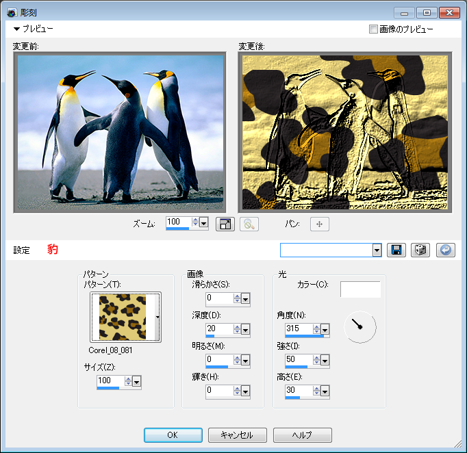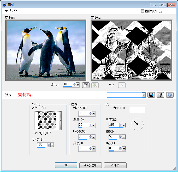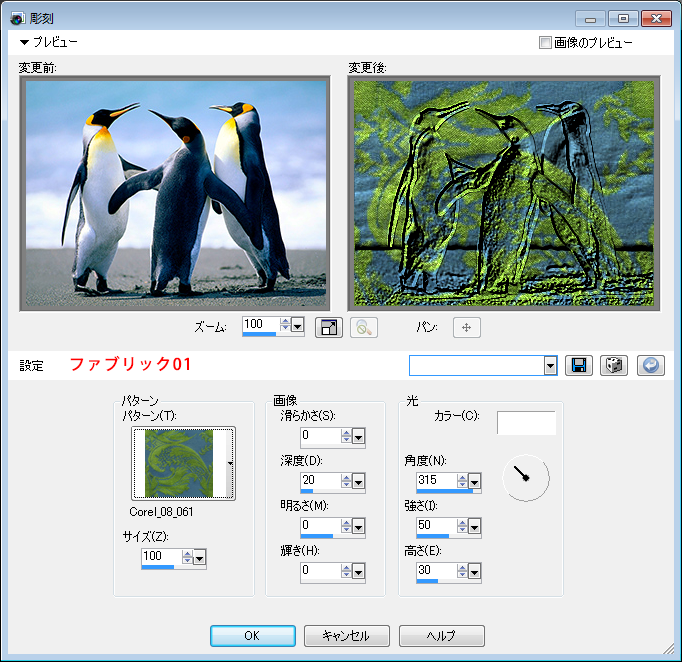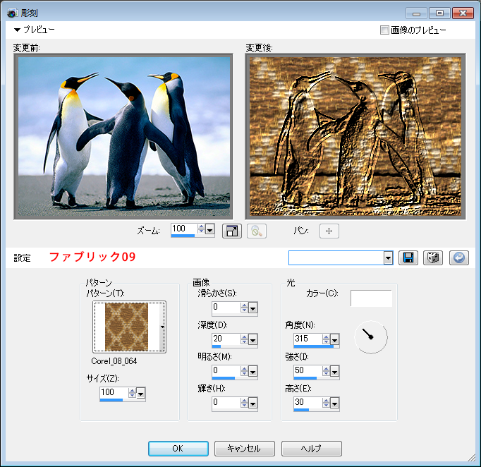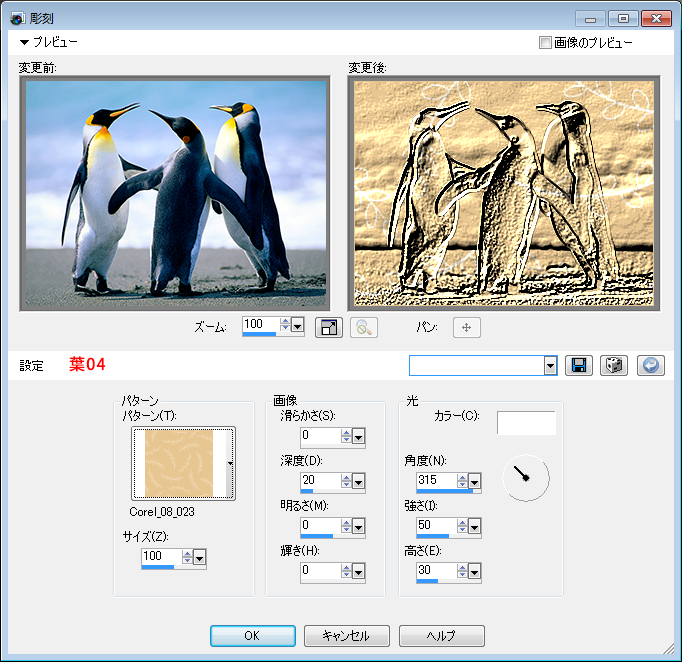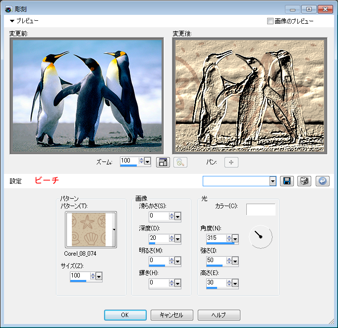 基本 「効果」→「テクスチャ効果」→「彫刻」の説明。 2017-02-24 | by sierrarei18 <<目次に戻る 「彫刻」は、画像が硬い輝く表面に彫られたようになります。 本ページでの説明画面は、バージョン12を使用しています。 1 「効果」→「テクスチャ効果」→「彫刻」を選択。 2 「彫刻」ダイアログボックスが表示されます。 「パターン」、「画像」、「光」の詳細設定ができます。 下の画像をクリックするとそれぞれの「彫刻」ダイアログボックが表示されます。 <<目次に戻る More from my site「効果」→「フォト効果」→「フィルムとフィルタ」の説明。ファイルの種類「jpg・jpeg」(ジェイペグ)での保存について彩度ツールの使い方はがきを印刷する方法「効果」→「歪み効果」→「レンズの歪み」の説明。「効果」→「イメージ効果」→「シームレスタイル」の説明。
