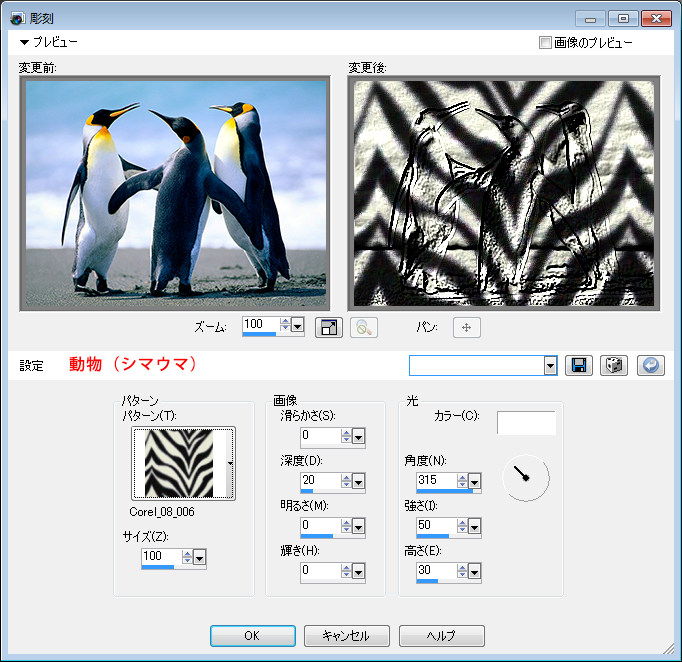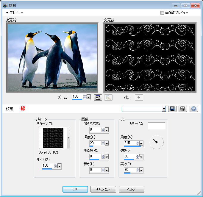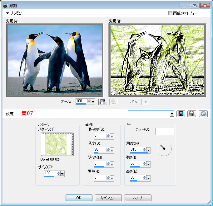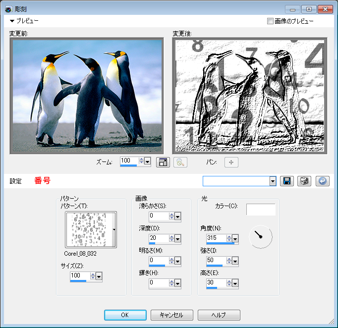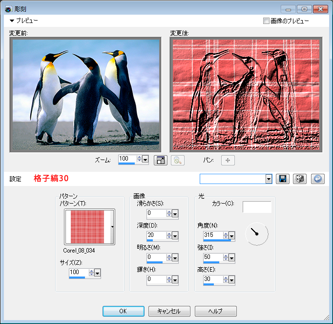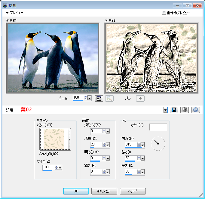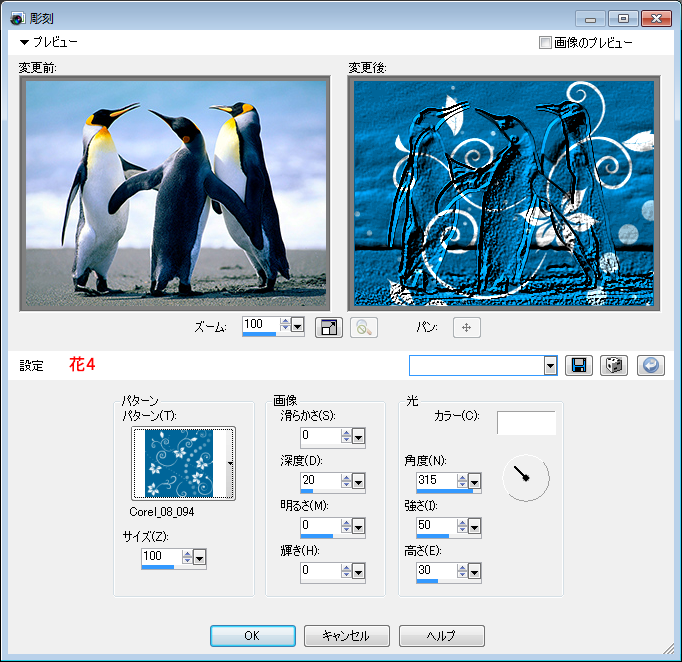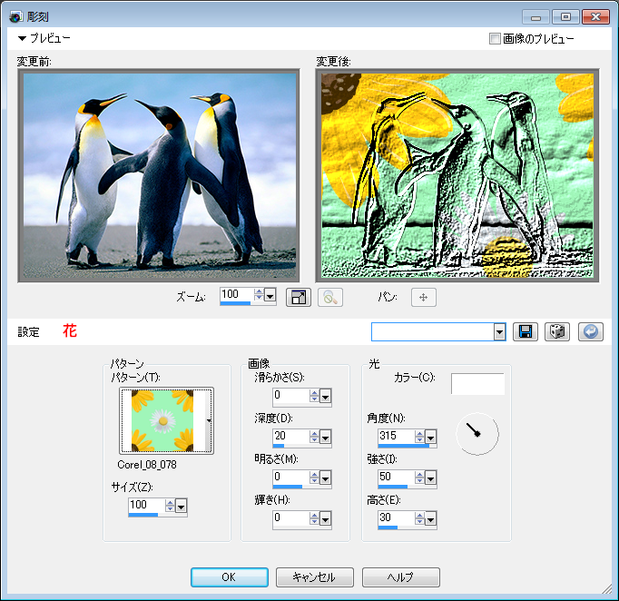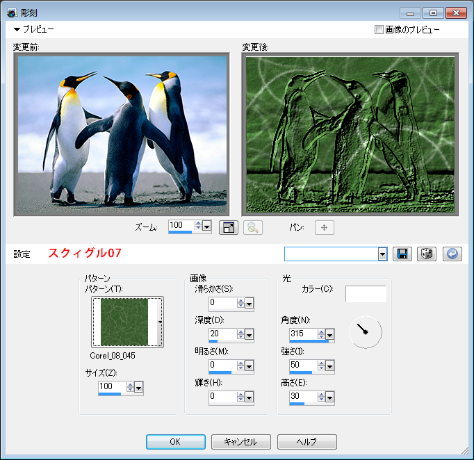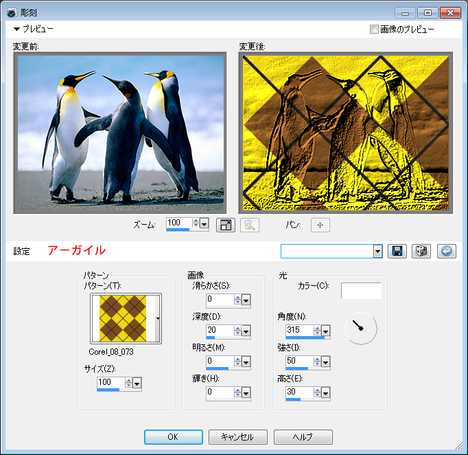 基本 「効果」→「テクスチャ効果」→「彫刻」の説明。 2017-02-24 | by sierrarei18 <<目次に戻る 「彫刻」は、画像が硬い輝く表面に彫られたようになります。 本ページでの説明画面は、バージョン12を使用しています。 1 「効果」→「テクスチャ効果」→「彫刻」を選択。 2 「彫刻」ダイアログボックスが表示されます。 「パターン」、「画像」、「光」の詳細設定ができます。 下の画像をクリックするとそれぞれの「彫刻」ダイアログボックが表示されます。 <<目次に戻る More from my site「効果」→「フォト効果」→「フィルムとフィルタ」の説明。ファイルの種類「jpg・jpeg」(ジェイペグ)での保存について彩度ツールの使い方はがきを印刷する方法「効果」→「歪み効果」→「レンズの歪み」の説明。「効果」→「イメージ効果」→「シームレスタイル」の説明。