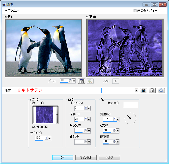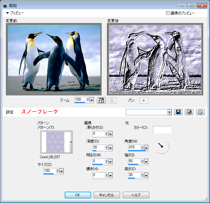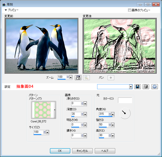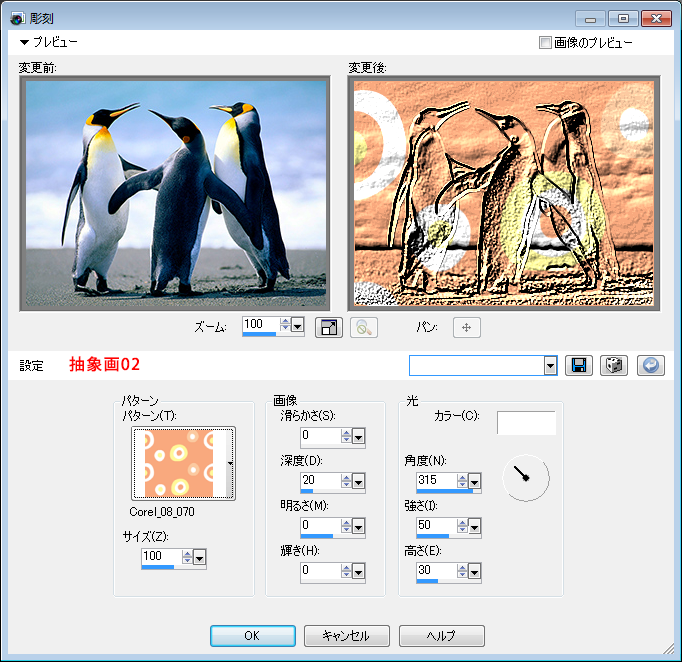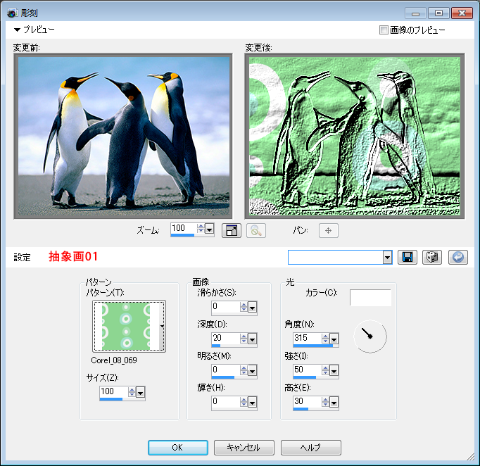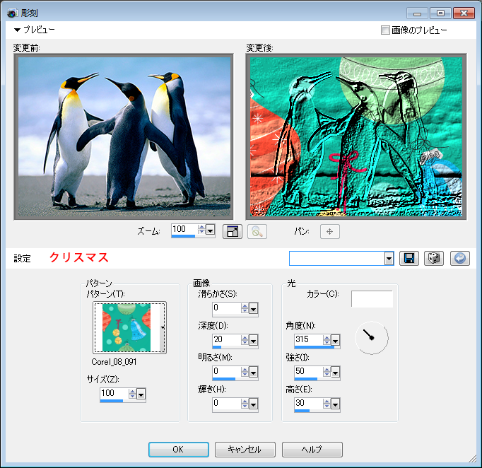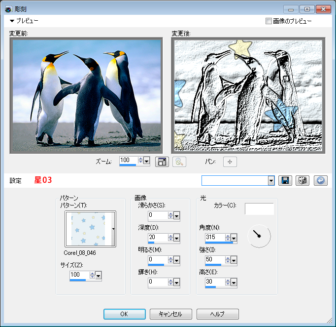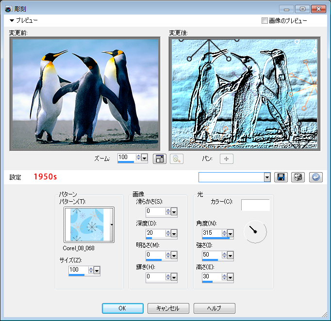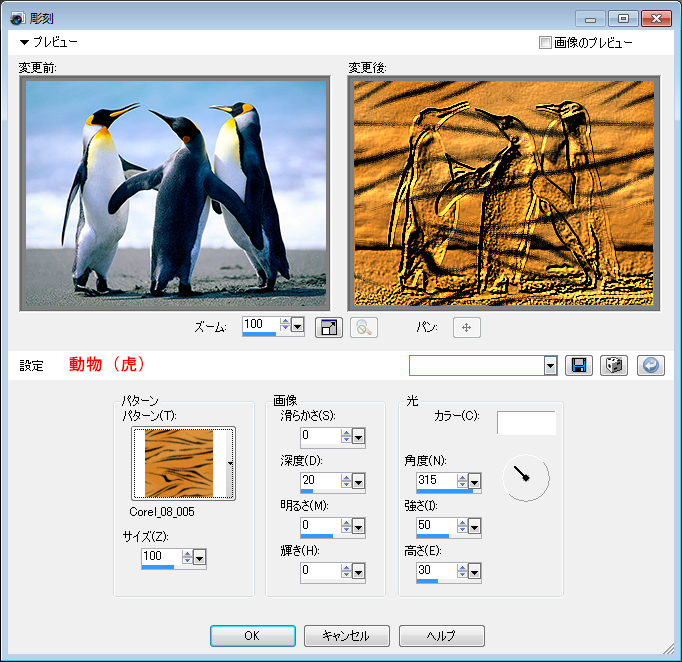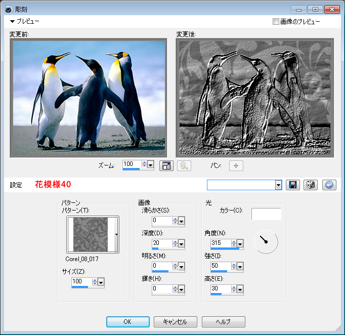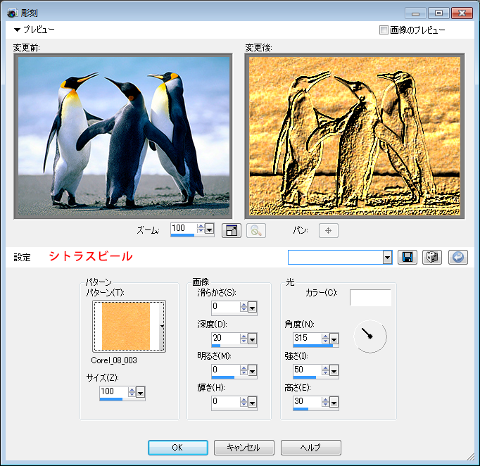 基本 「効果」→「テクスチャ効果」→「彫刻」の説明。 2017-02-24 | by sierrarei18 <<目次に戻る 「彫刻」は、画像が硬い輝く表面に彫られたようになります。 本ページでの説明画面は、バージョン12を使用しています。 1 「効果」→「テクスチャ効果」→「彫刻」を選択。 2 「彫刻」ダイアログボックスが表示されます。 「パターン」、「画像」、「光」の詳細設定ができます。 下の画像をクリックするとそれぞれの「彫刻」ダイアログボックが表示されます。 <<目次に戻る More from my site「効果」→「フォト効果」→「フィルムとフィルタ」の説明。ファイルの種類「jpg・jpeg」(ジェイペグ)での保存について彩度ツールの使い方はがきを印刷する方法「効果」→「歪み効果」→「レンズの歪み」の説明。「効果」→「イメージ効果」→「シームレスタイル」の説明。