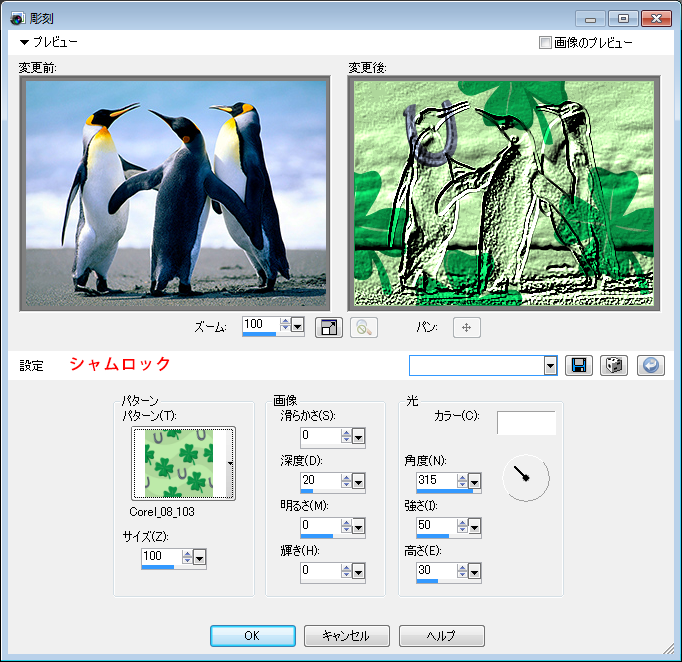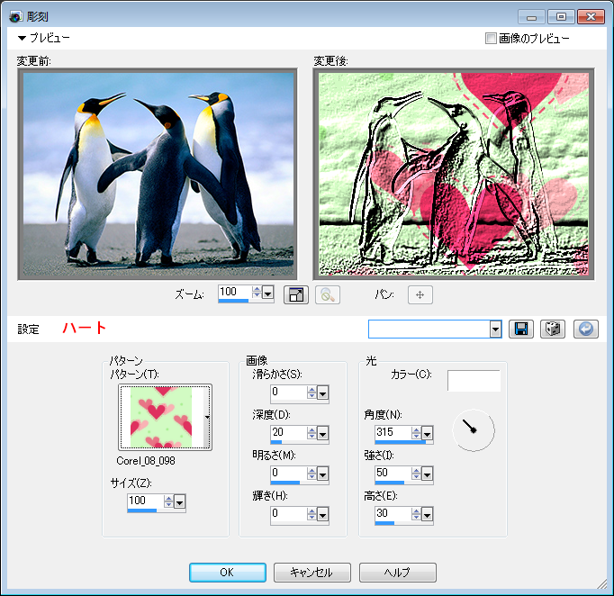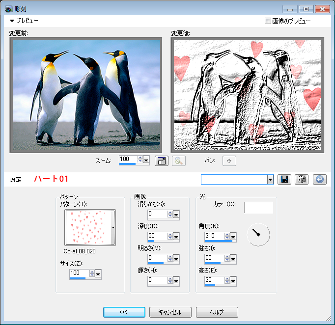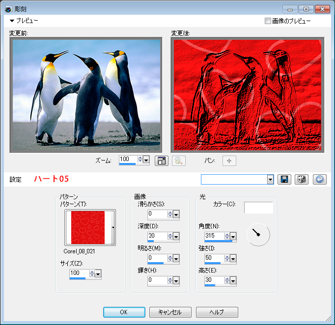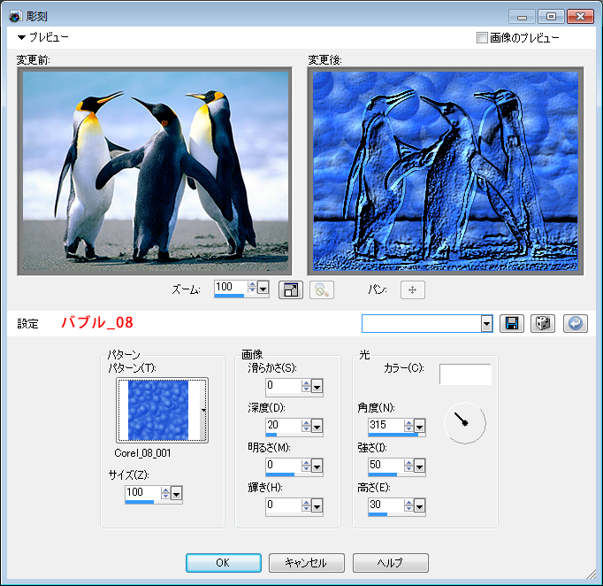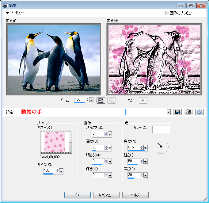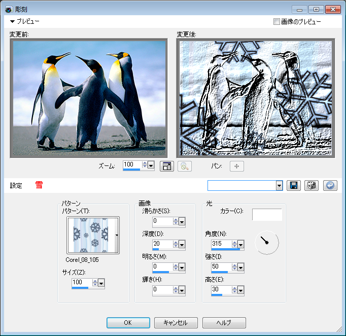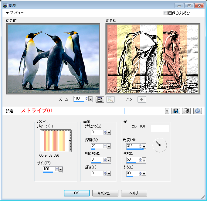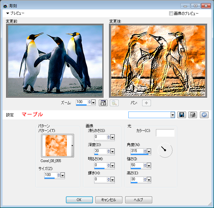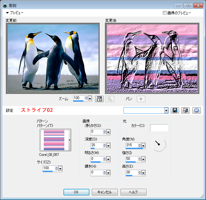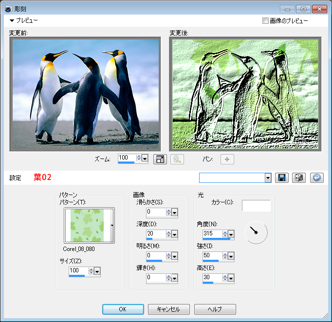 基本 「効果」→「テクスチャ効果」→「彫刻」の説明。 2017-02-24 | by sierrarei18 <<目次に戻る 「彫刻」は、画像が硬い輝く表面に彫られたようになります。 本ページでの説明画面は、バージョン12を使用しています。 1 「効果」→「テクスチャ効果」→「彫刻」を選択。 2 「彫刻」ダイアログボックスが表示されます。 「パターン」、「画像」、「光」の詳細設定ができます。 下の画像をクリックするとそれぞれの「彫刻」ダイアログボックが表示されます。 <<目次に戻る More from my site「効果」→「フォト効果」→「フィルムとフィルタ」の説明。ファイルの種類「jpg・jpeg」(ジェイペグ)での保存について彩度ツールの使い方はがきを印刷する方法「効果」→「歪み効果」→「レンズの歪み」の説明。「効果」→「イメージ効果」→「シームレスタイル」の説明。