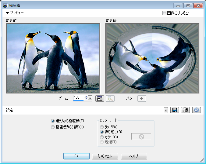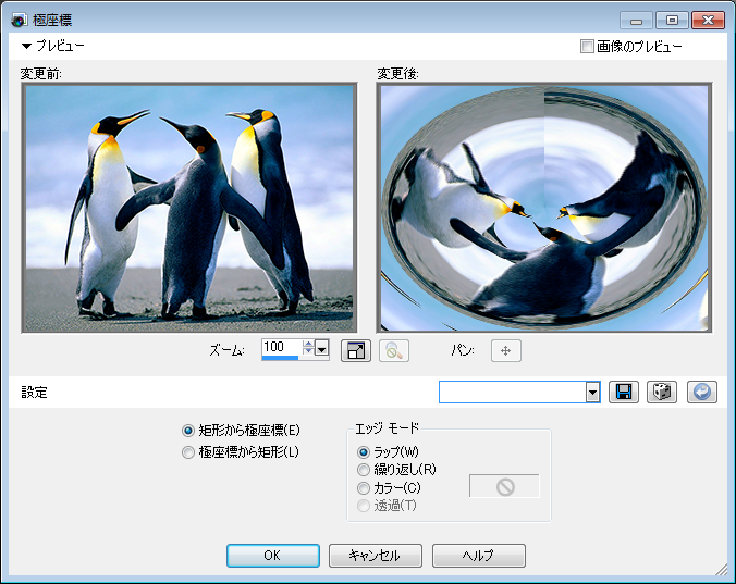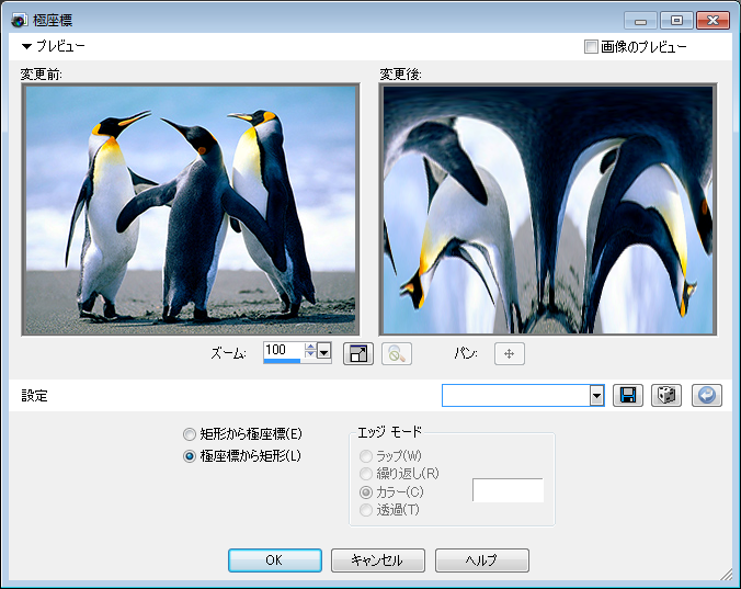 基本 「効果」→「歪み効果」→「極座標」の説明。 2017-02-24 | by sierrarei18 <<目次に戻る 「極座標」を使用すると、画像が指定されたサイズの長方形または正方形に分割されます。 本ページでの説明画面は、バージョン12を使用しています。 1 「効果」→「歪み効果」→「極座標」を選択 2 「極座標」ダイアログボックスが表示されます。 「矩形から極座標」「極座標から矩形」の選択、「エッジモード」の設定が可能です。 下記画像をクリックすると「極座標」ダイアログ画面が表示されます。 <<目次に戻る More from my site車のボディ側面や壁などに文字を自然な感じで合成する方法ファイルの種類「png」(ピング)での保存について「スクラッチ除去」ツールにより画像内のスクラッチや傷を除去する方法自由選択ツールシャープネスツールの使い方ツールパレット:1